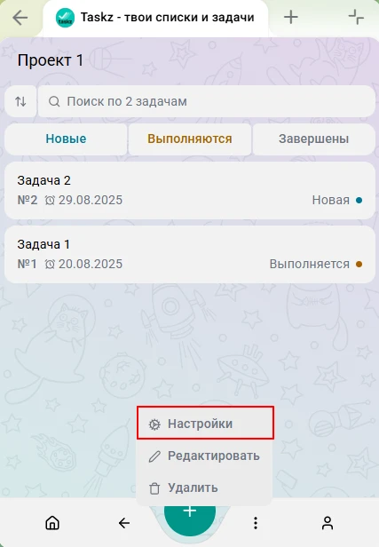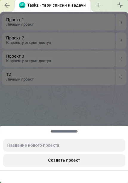 Бот позволяет создавать несколько проектов, распределяя задачи по категориям. Например, можно вести отдельные проекты для работы, личных дел или учебных заданий. В каждом проекте можно добавлять задачи, указывать их статус ("Новое", "Выполняется", "Закрыто") и следить за прогрессом.