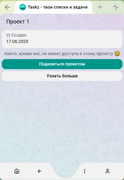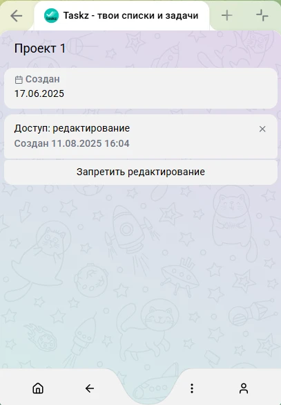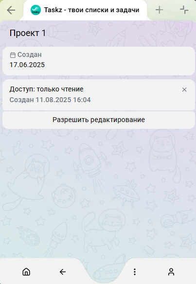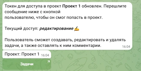 Бот поддерживает коллаборацию – вы можете приглашать других пользователей в проект, отправляя им ссылку-приглашение. При этом можно настроить уровень доступа: редактирование (добавление, изменение и удаление задач) или только просмотр.